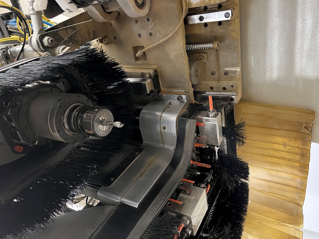 | Machine Capacities: | -Working field, X-axis: 3200mm (125.9") -Working field, Y-axis: 1315mm (51.7") -Maximum material thickness: 150mm (5.9") -Positioning speed, X-axis: 80 MPM (262 FPM) -Positioning speed, Y-axis: 80 MPM (262 FPM) -Positioning speed, Z-axis: 20 MPM (66 FPM) -Axis stroke, X-axis: 3752.5mm (14.7") -Axis stroke, Y-axis: 1639mm (64.5") -Axis stroke, Z-axis: 160mm (6.3") BORING UNIT -12 spindles for vertical boring -6 spindles for horizontal boring -Motor: 1.7kW (2.5 HP) -Saw diameter: 120mm (4.7") -Saw unit motor power: 1.7kW (2.5HP) ROUTING UNIT -Motor: 7.5kW (10.5HP) -Connection: ISO30 -Tool shank dimensions: 6-25mm (0.23-1") -10 position ride-along tool magazine -Maximum tool diameter: 160mm (6.3") -Dimensions: 6000 x 2200 x 2100mm (19.7` x 7.2` x 6.9`) -Weight: 3300kg Video available of machine in operation. |