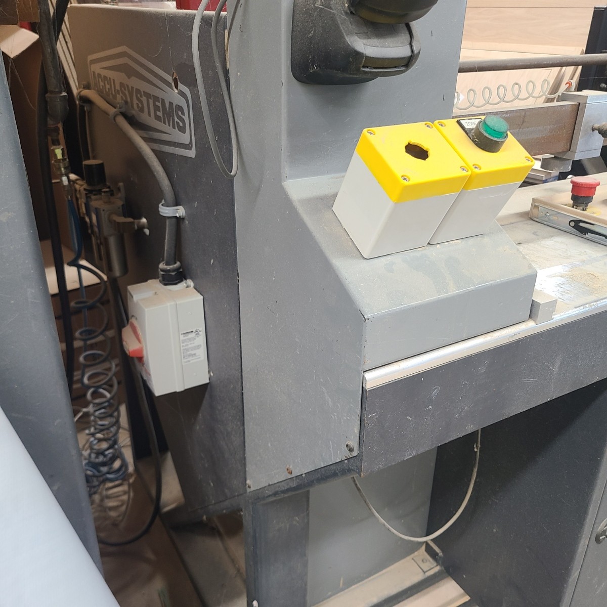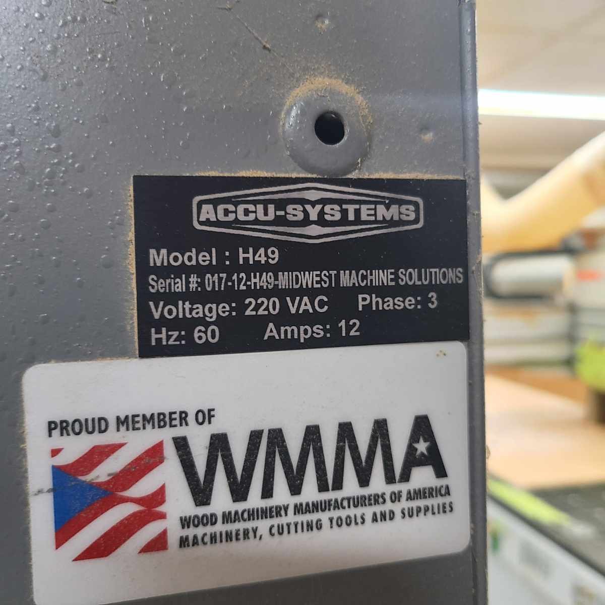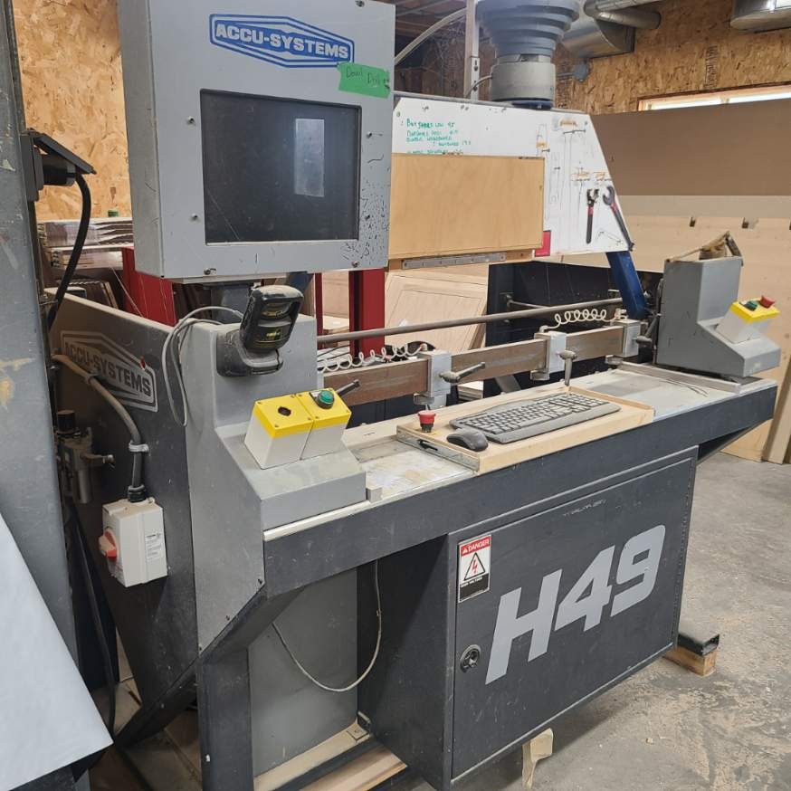 | Machine Capacities: | Horizontal bore and dowel 49" wide worktable of 1/2" thick machined aluminum to ensure a true and reliable reference point 1 HP 18,000 RPM single spindle drill Cycle time of approx. 1-1/2 seconds for each bore glue and dowel insertion when the holes are spaced at 64 mm intervals (4) quick adjust vertical clamps Adjustable back fence 1/2" min. material thickness Glue inserter with water or glue capability "Direct Reject System" dowel inserter 8 mm dia. vibratory dowel bowl PC operator interface with 12" touchscreen 2 work zones allowing for pendulum processing The H-49`s operator interface has been designed to allow for quick programming at the machine Typically your operator can create and activate a new program in less than one minute |