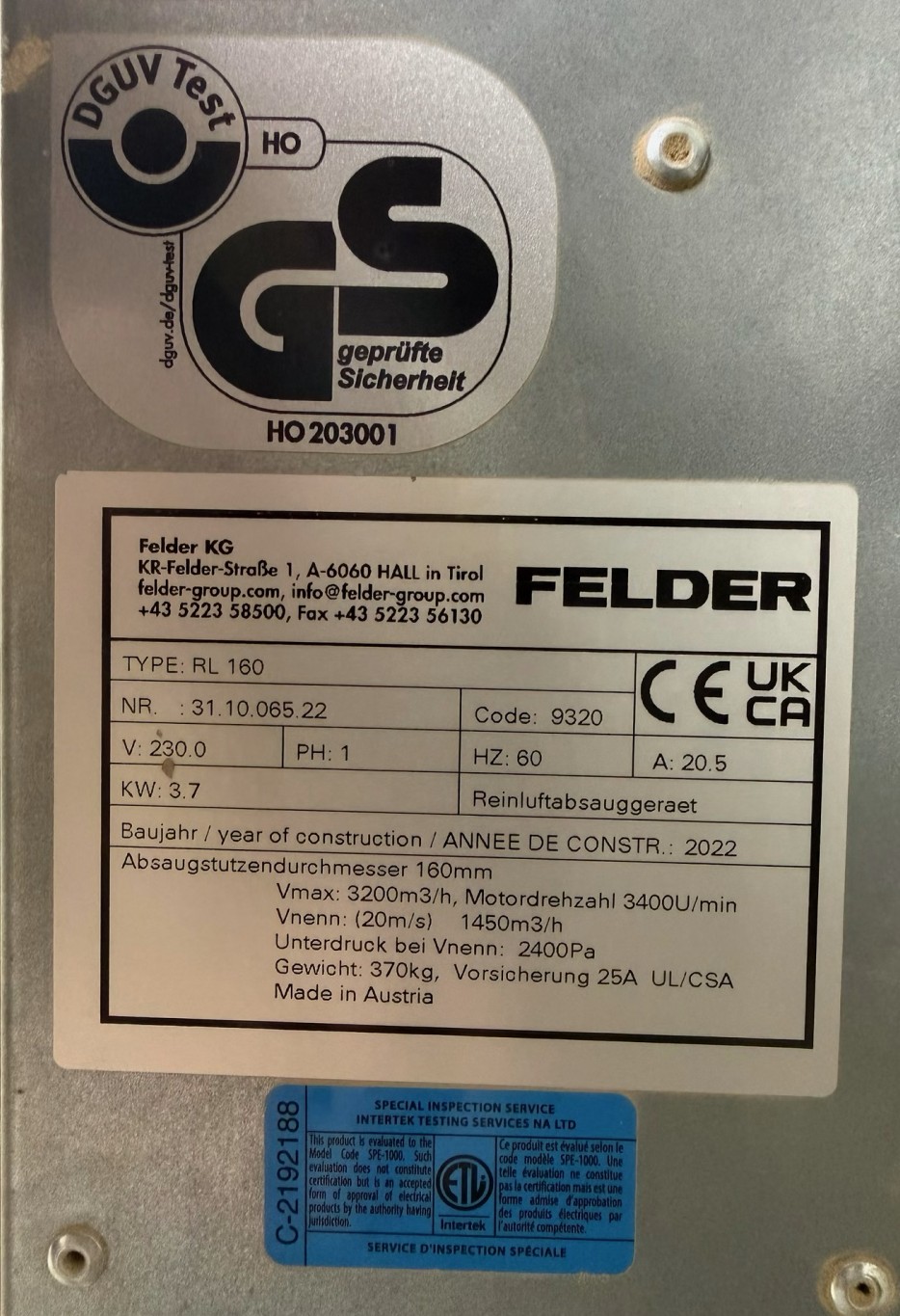 | Machine Capacities: | - 1.5 years old - Max. air flow rate: 1,883 cfm (3,200 m³/h) - Nominal air flow rate: 65 ft/sec (20 m/sek), 853 cfm (1,450 m³/h) - Vacuum: 2,200 Pa - Filter (surface) area: 108 ft² (10 m²) - Extraction port diameter: 6¼" (160 mm) - Remaining dust concentration, left-over dust content: < 0.1 mg |