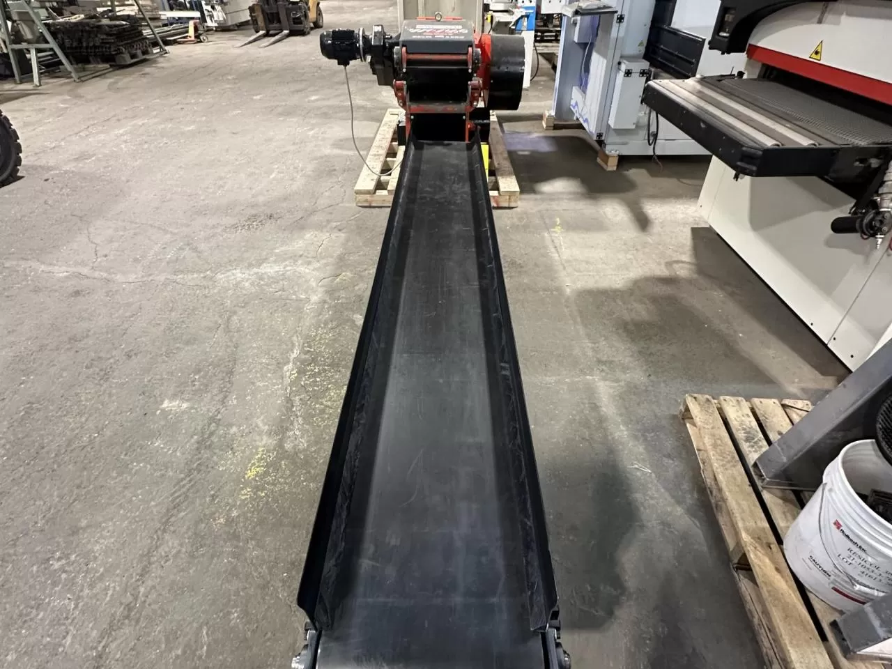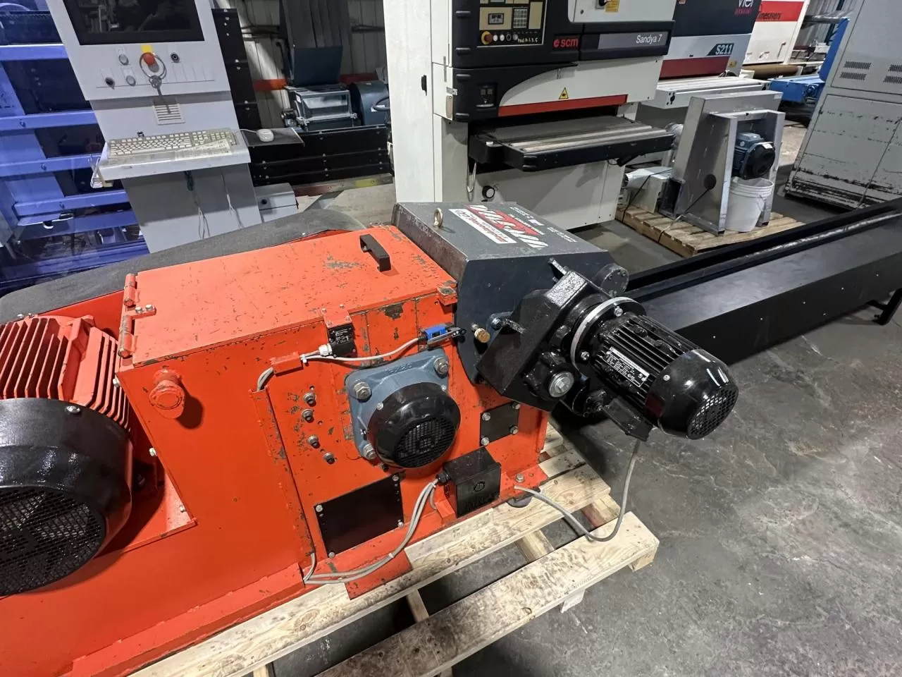 | Machine Capacities: | Infeed opening: 400 x 160 mm (15¾" x 6") Motor: 40 HP, 600 Volts, 60 Hz, 3 Phase Hydraulic infeed roller Rotor: 368 mm (14½") diameter, 22 cutters (knife inserts) Rotor speed: 450–600 RPM Discharge connection: 250 mm (10") diameter, 3,000 CFM Weight: 1,900 kg (4,200 lbs) Brand new infeed conveyor 10 ft, brand new motor on the infeed roller, cutting knives, anvil plate remade by a machinist and more |