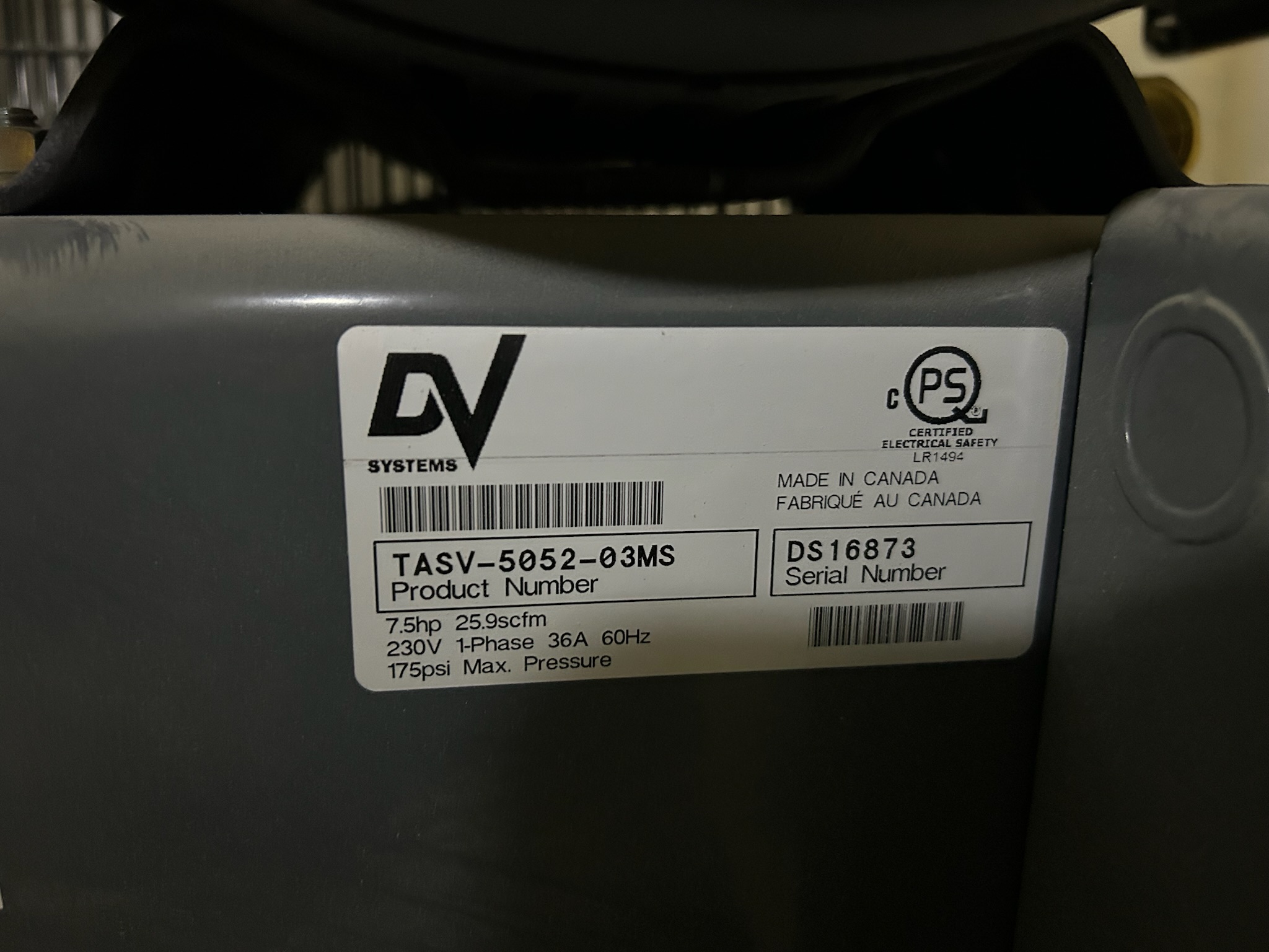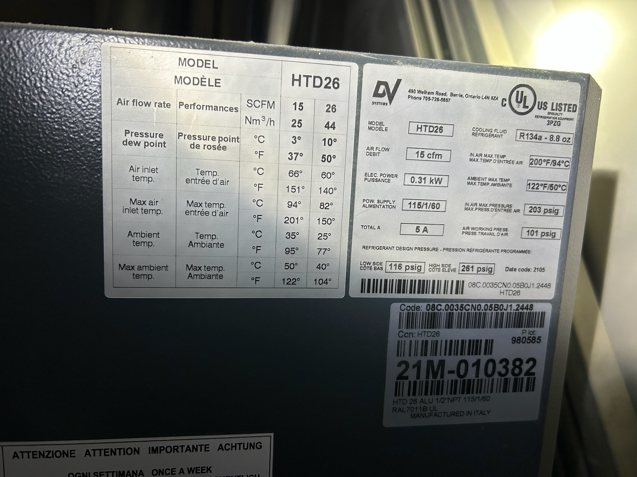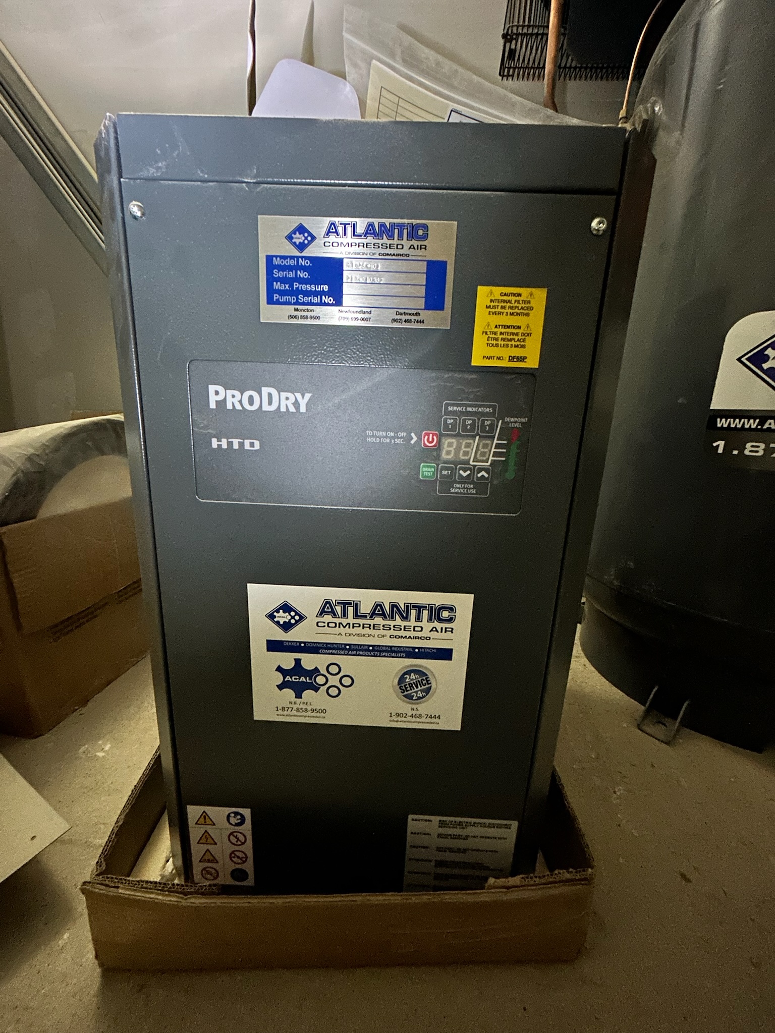 | Machine Capacities: | 7.5 HP air Compressor complete with an air dryer. note: has some torn labels and scratches but NEVER connected to power. |